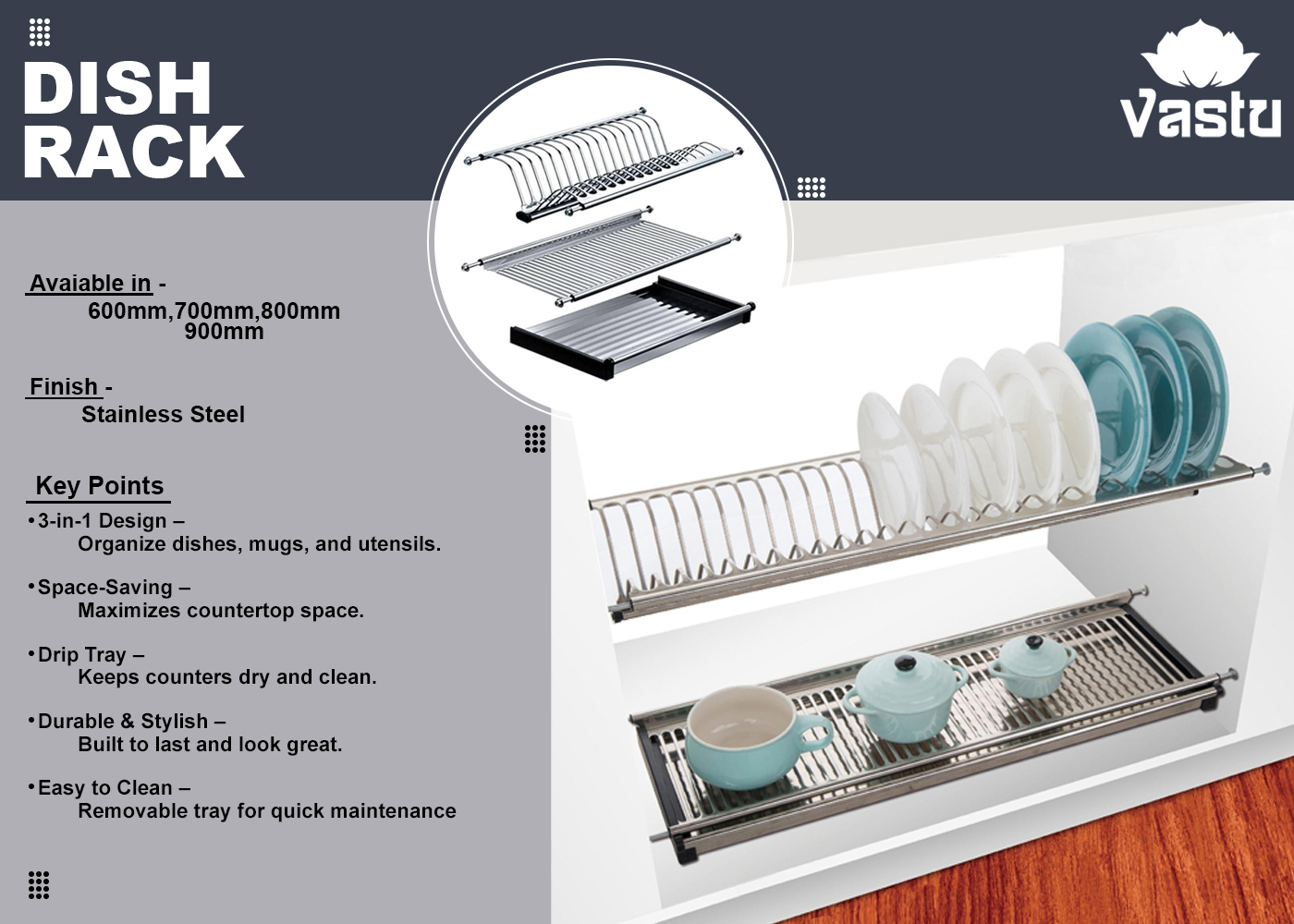 "Keep your kitchen organized with our durable and stylish dish racks. Designed for efficient drying and space-saving storage, they combine functionality with a sleek aesthetic."